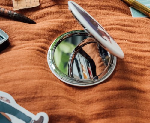 There are mirrors on the top and bottom, with a normal version on one side and a magnifying glass on the other!